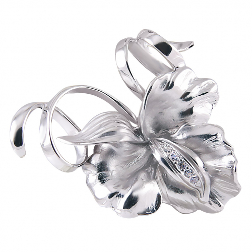 Нежная подвеска, в виде открытого цветка, выполнена из серебра 925 пробы, украшена сверкающими фианитами Сваровски.