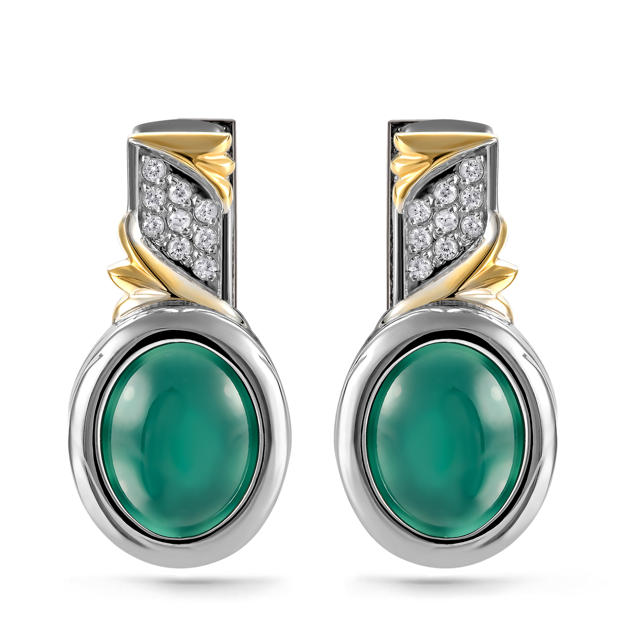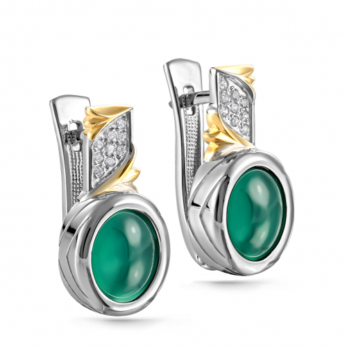 Серьги, выполнены из серебра 925 пробы, украшены позолотой, россыпью фианитов и увенчаны крупными ониксами зеленого цвета. Тип замка - английский, самый надежный и удобный.