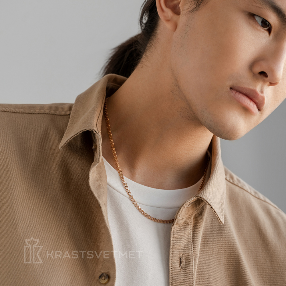 Крупная облегчённая цепь из насыщенного красного золота 585 пробы с плетением «Лав» и богато обработанной алмазной гранью. Широкие звенья притягивают взгляд своей монументальностью и роскошью, привлекательно переливаясь на солнце и освещая лицо своей обладательницы яркими отблесками. Покрытие алмазной гранью наделяет поверхность изделия дополнительным объемом и живой динамикой, которая раскрывается при движении. Проверенная временем прочность плетения «Лав» делает эту цепочку надежным спутником в повседневной жизни и при торжественном выходе. Подходит как для самостоятельных композиций, так и в сочетании с подвесками, подчёркивая лучшие стороны образа своего владельца. Диаметр проволки 0,60 мм. Представлено брендом КРАСЦВЕТМЕТ.