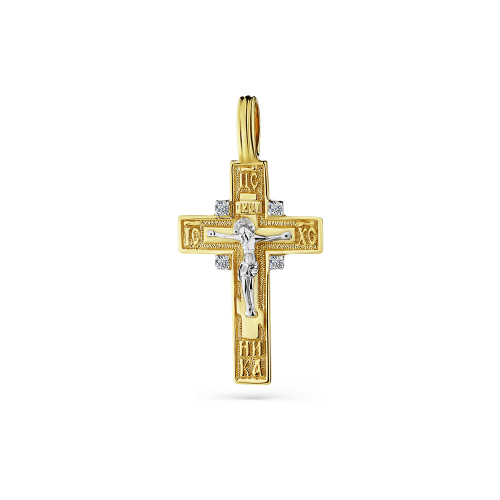 Подвеска в виде православного крестика с фианитами выполнена из красного и белого золота 585 пробы