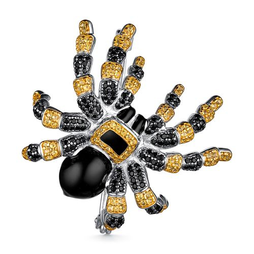 Яркая брошь выполнена в анималистическом стиле из серебра 925 пробы и украшена цветными сияющими фианитами и черной эмалью