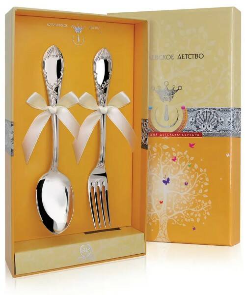 Детский десертный набор "Престиж", состоящий из ложки и вилки, выполнен из серебра 925 пробы без примесей посторонних металлов и без применения гальванического покрытия
