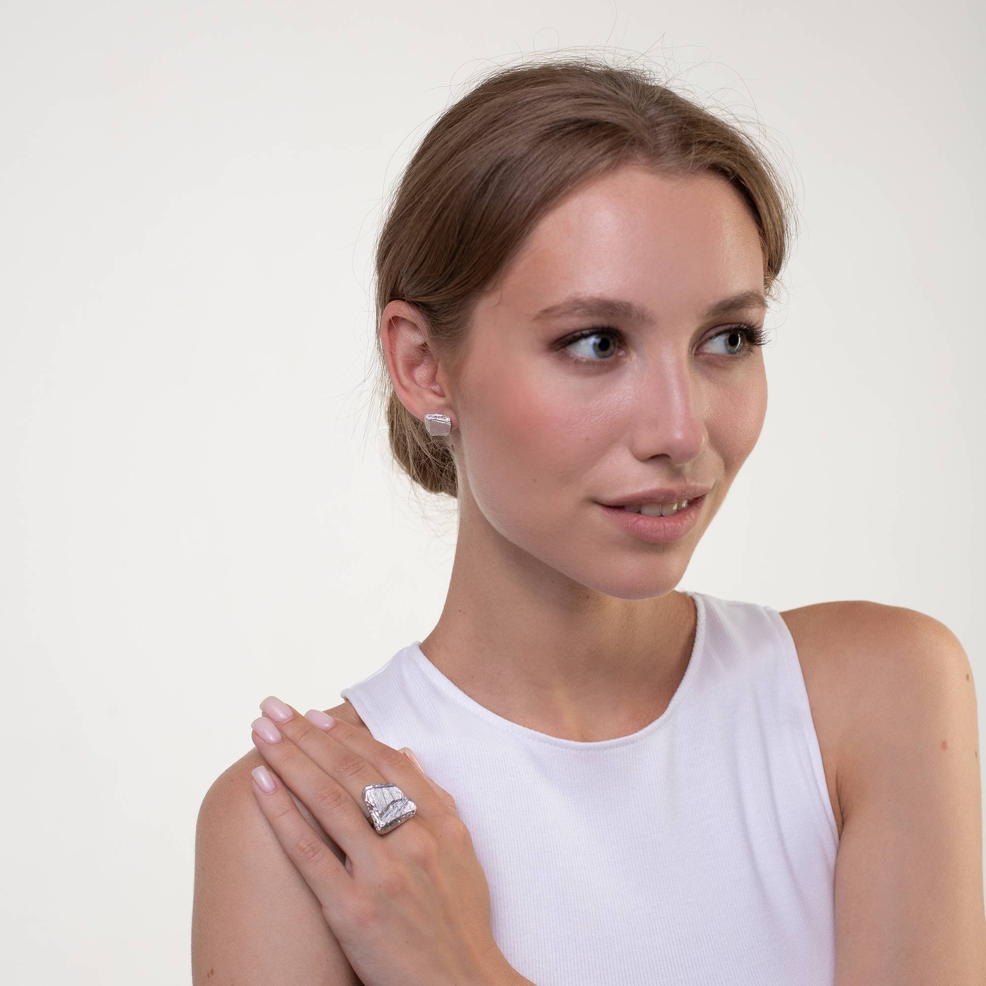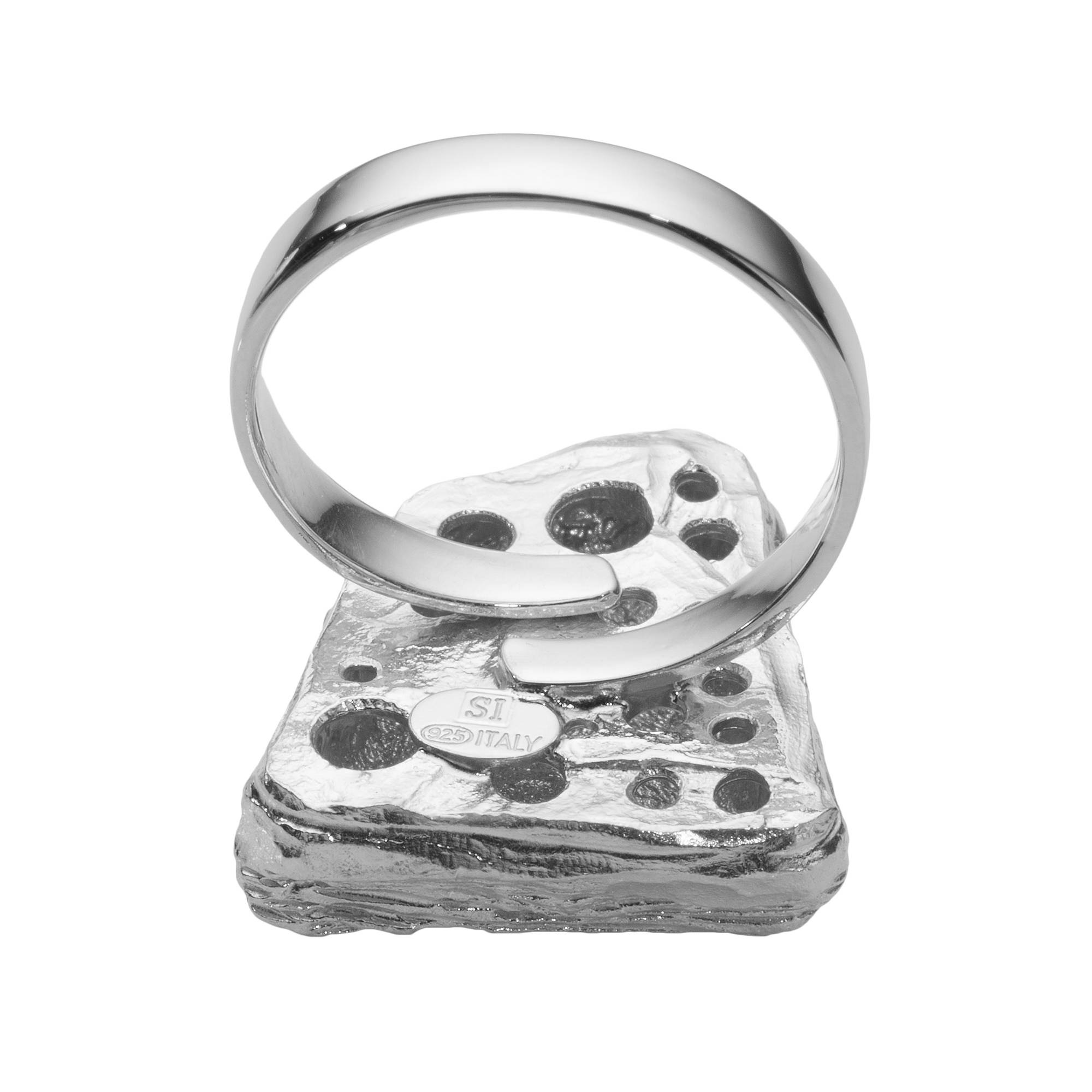 Эффектное объемное кольцо выполнено из серебра 925 пробы с покрытием белым родием — благодаря ему, изделие не темнеет