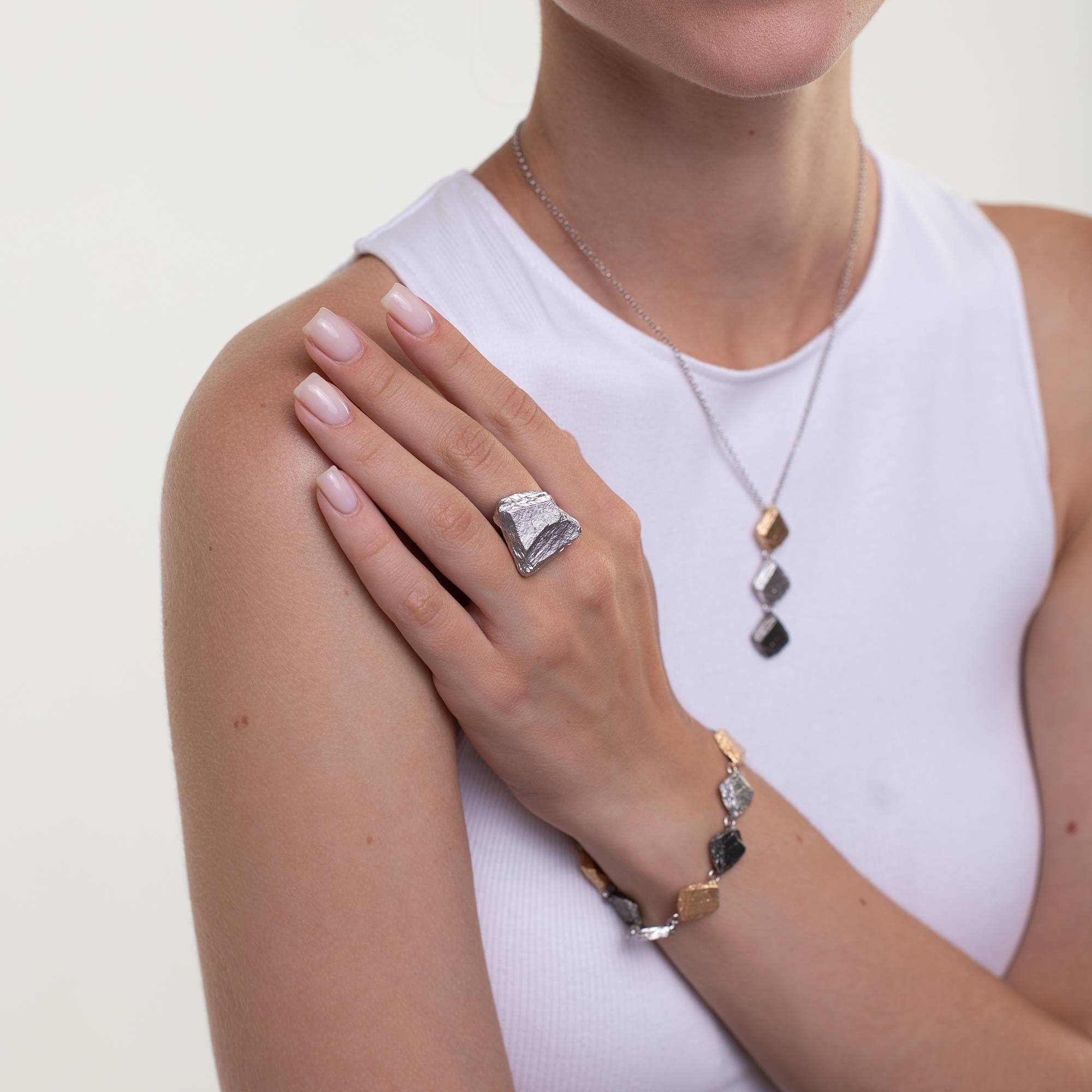 Эффектное объемное кольцо выполнено из серебра 925 пробы с покрытием белым родием — благодаря ему, изделие не темнеет. Матовая обработка смотрится роскошно и одновременно сдержанно. Кольцо регулируется под размер пальца за счет гибкой конструкции. Изделие представлено брендом: STILE ITALIANO. В комплект поставки входит: