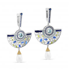 Яркие и привлекательные удлиненные серьги, украшенные разноцветной эмалью, фианитами и жемчугом, выполнены из родированного серебра 925 пробы