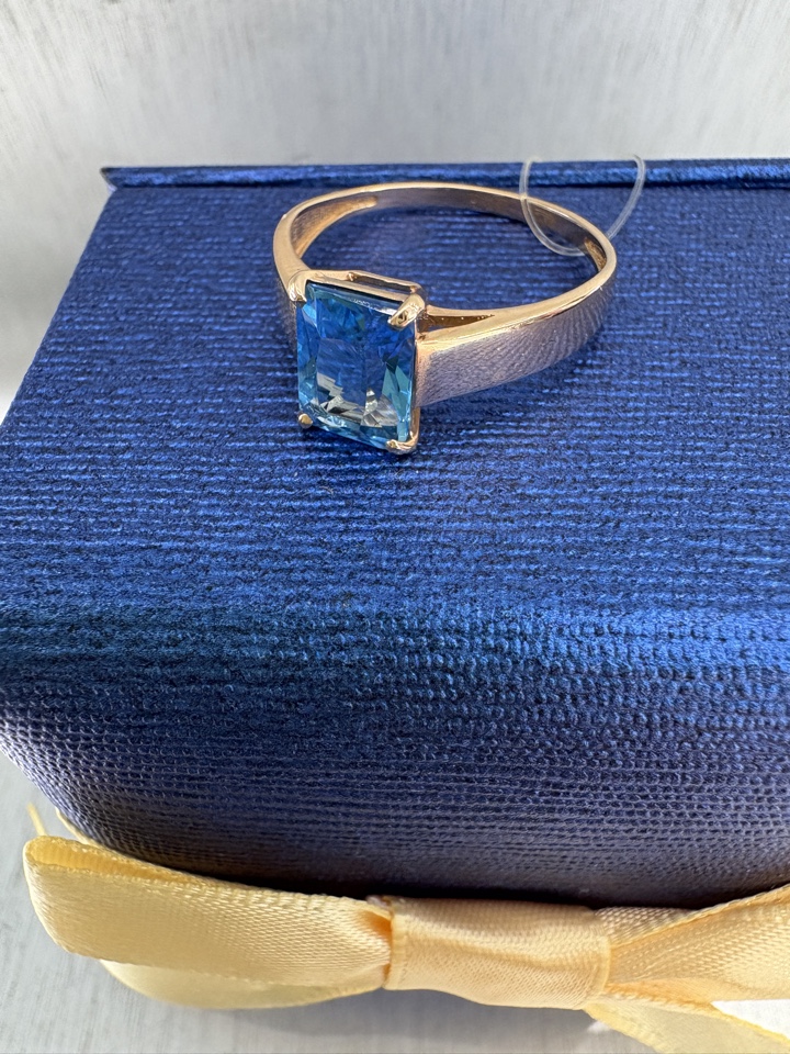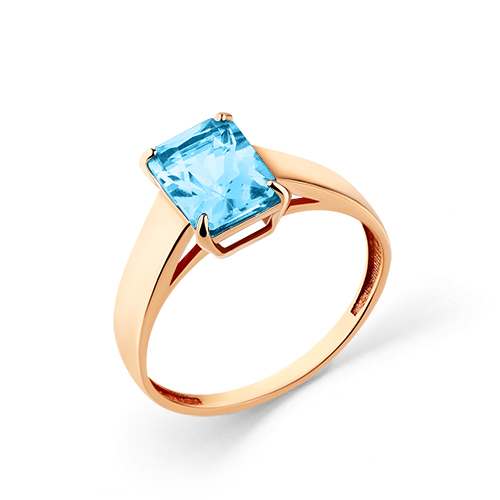 Лаконичное кольцо с голубым топазом выполнено из красного золота 585 пробы