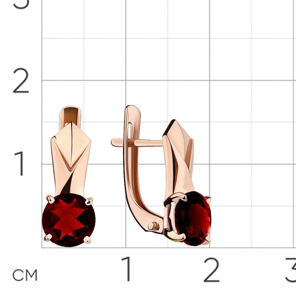 Серьги выполнены из красного золота 585 пробы, украшены великолепными красными гранатами круглой формы