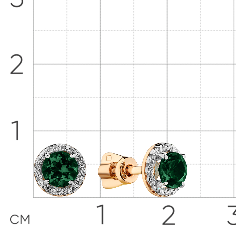 Классические серьги - пусеты украшены турмалинами зеленого цвета в окружении сверкающих фианитов, выполнены с сочетанием красного и белого золота 585 пробы