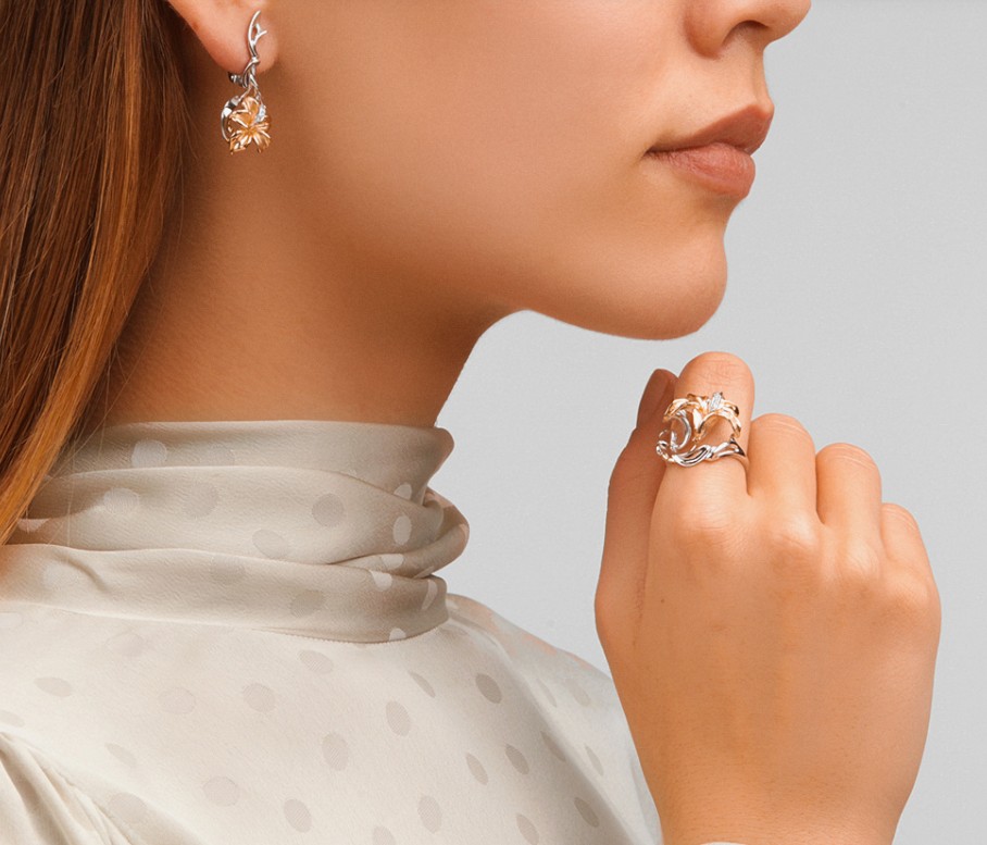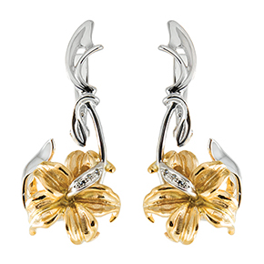 Нежные серьги, в виде открытого цветка, выполнены в сочетании жёлтого и белого золота 585 пробы, украшены сверкающими бриллиантами. Закрепка камней в белом золоте визуально увеличивает их объем и подчеркивает блеск и красоту.