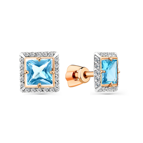 Серьги-пусеты в сочетании красного и белого золота 585 пробы. Центральное место занимает глубокий голубой топаз, символизирующий спокойствие и уверенность, окружённый сверкающими фианитами, создающими иллюзию бесконечного блеска. Представлено брендом MAGIC STONES. В комплект поставки входит:
