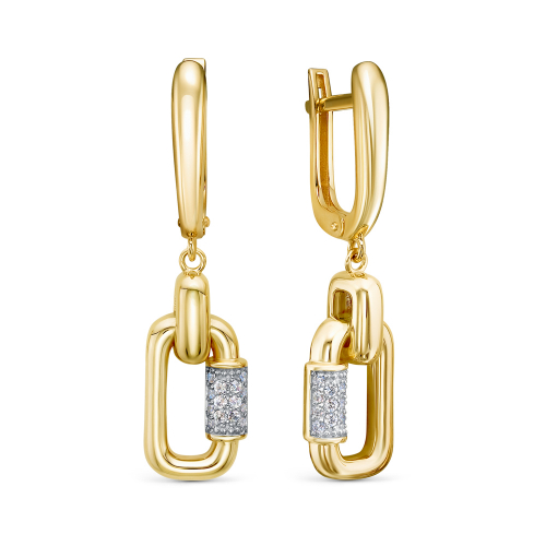 Удлинённые серьги с подвесками, украшенными фианитами, выполнены из жёлтого и белого золота 585 пробы. Дизайн изделия в стиле современная ювелирная классика. Серьги универсальные и подойдут как для более торжественных, так и для повседневных образов. Тип замка - английский, самый надежный и удобный. Изделие представлено брендом BERGER. Средняя характеристика камней на артикул: 36 Фианит. В комплект поставки входит:
