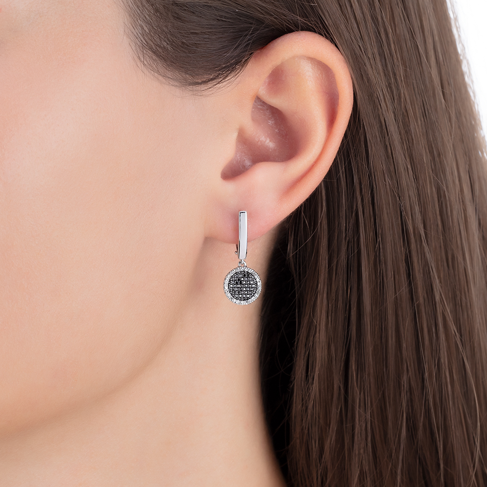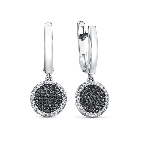 Стильные удлиненные серьги выполнены из белого золота 585 пробы, украшенные эффектным сочетанием черно-белых бриллиантов