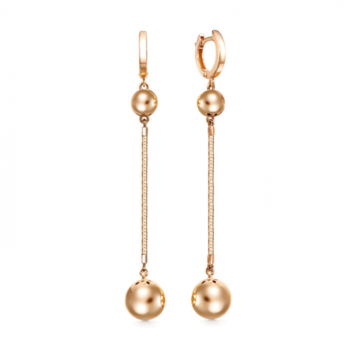 Удлинённые серьги с цепочными подвесками, украшенными изящным шариком, выполнены из жёлтого золота 585 пробы