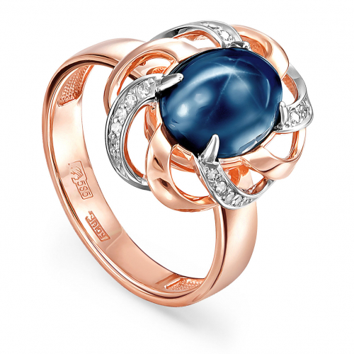 Роскошное кольцо, выполнено в сочетании красного и белого золота 585 пробы, украшено звездным сапфиром синего цвета и россыпью бриллиантов