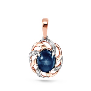 Подвеска выполнена в сочетании красного и белого золота 585 пробы, украшена сапфиром звёздным синего цвета овальной формы и россыпными дорожками сияющих бриллиантов.