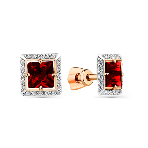Серьги-пусеты выполнены из красного и белого золота 585 пробы, украшены гранатами в окружении сверкающих фианитов, блеск которых подчёркивает цвет и красоту камня