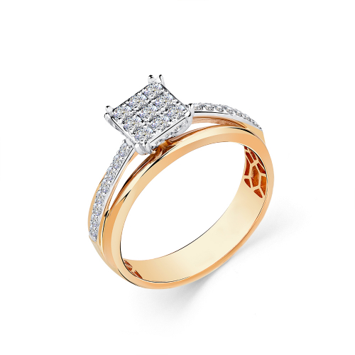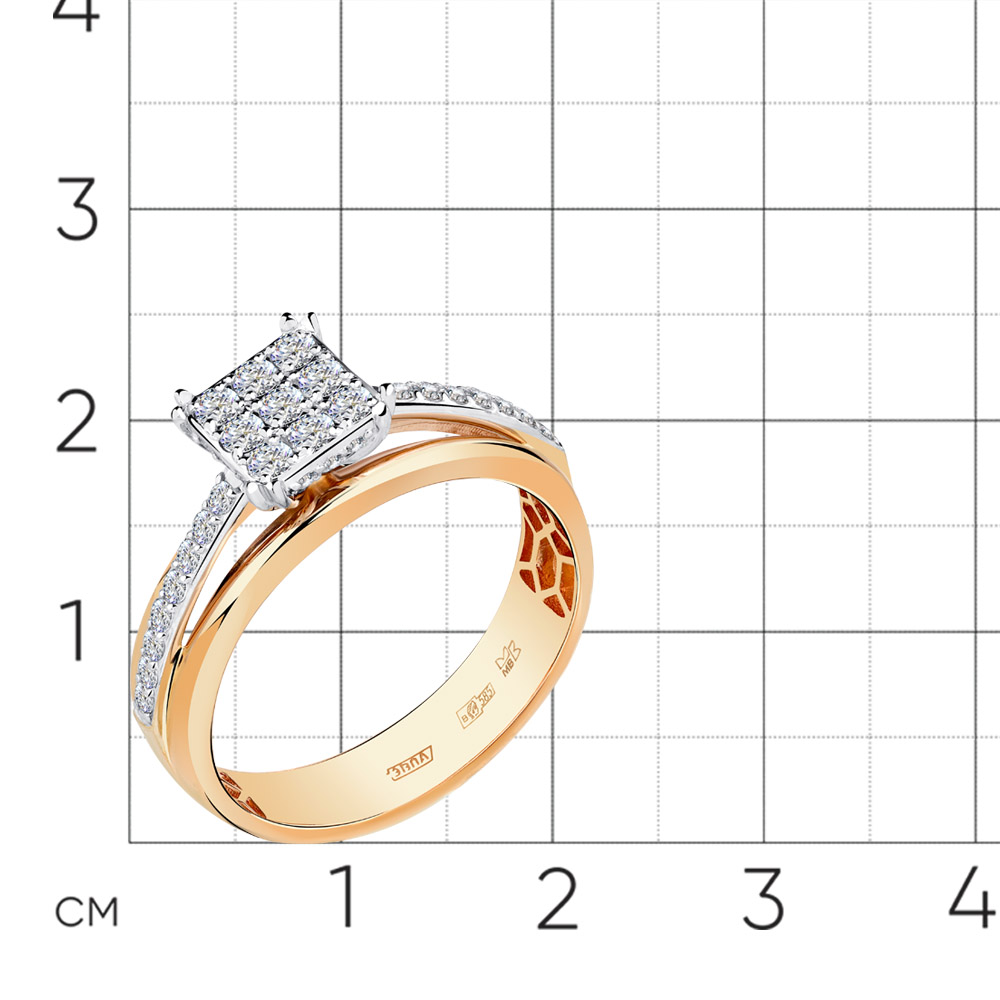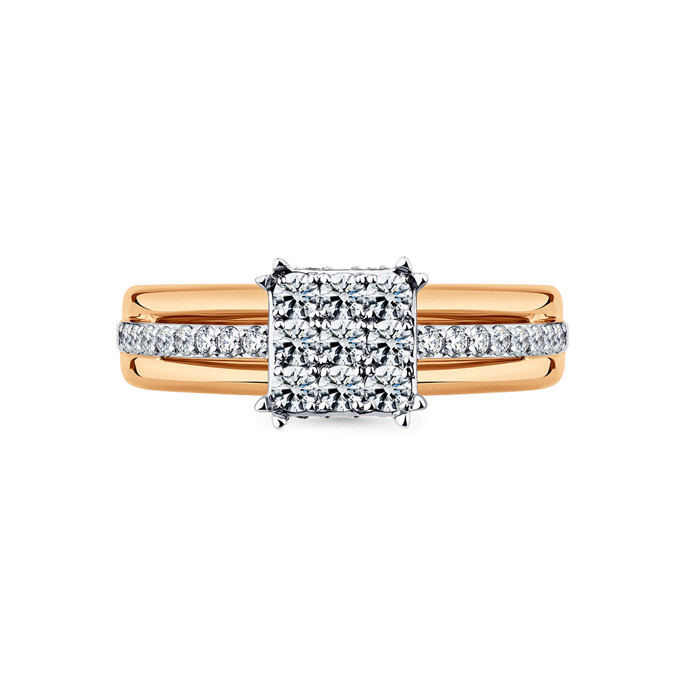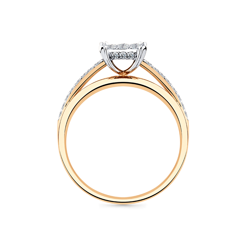 Кольцо с бриллиантами в касте квадратной формы, сияние которых подчёркивает дорожка меньших по размеру бриллиантов, выполнено из красного и белого золота 585 пробы
