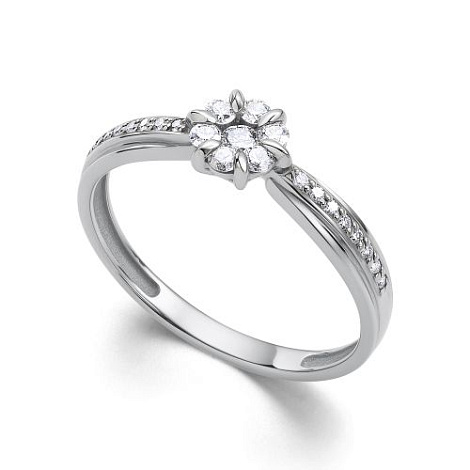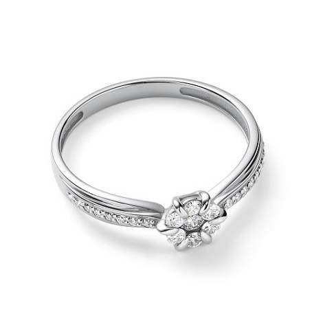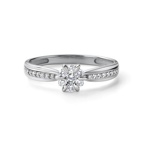 Кольцо с бриллиантами на изящном касте в виде цветка, выполнено из белого золота 585 пробы. Бриллианты на белом золоте смотрятся особенно эффектно, привлекая взгляд своим блеском. Изделие представлено брендом "Алькор". Средняя характеристика камней на артикул: 16 Бриллиант Круг 57 0.067 4/6, 1 Бриллиант Круг 57 0.061 4/6, 6 Бриллиант Круг 57 0.138 4/6 В комплект поставки входит: