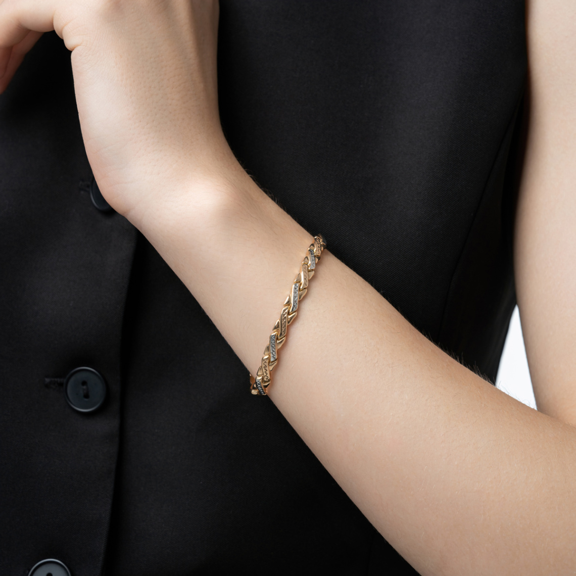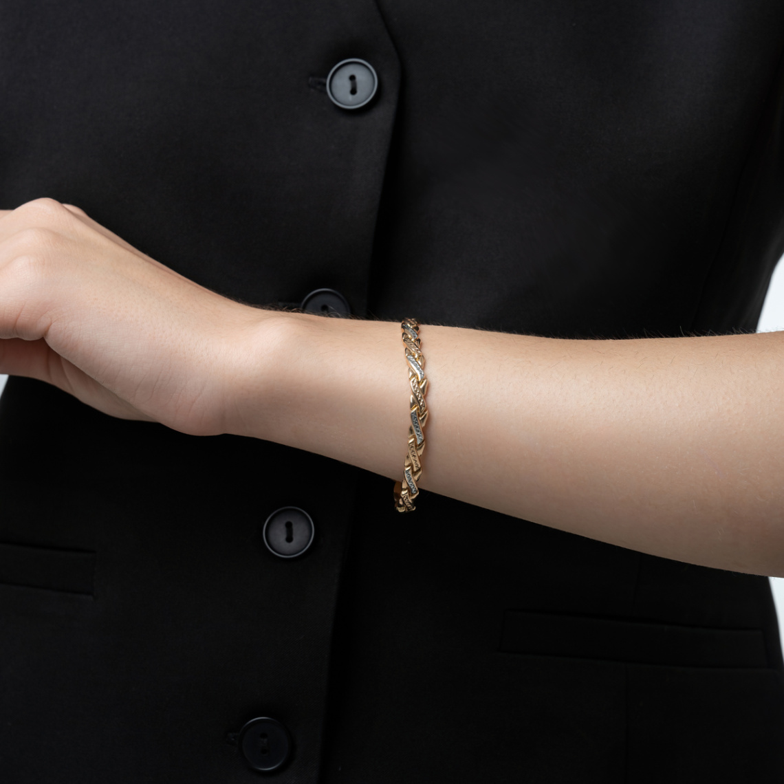 Браслет из комбинированного золота и с алмазной обработкой,эффектно переливается, что для меня было важным и могу этот браслет комбинировать с имеющими ювелирными украшениями.Надежный замок и проверенный завод изготовитель.
