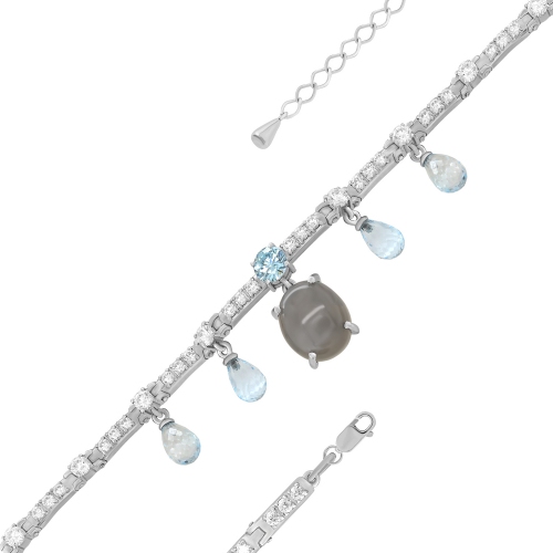 Стильный браслет с лунным камнем, голубыми топазами и сверкающими фианитами, выполнен из серебра 925 пробы