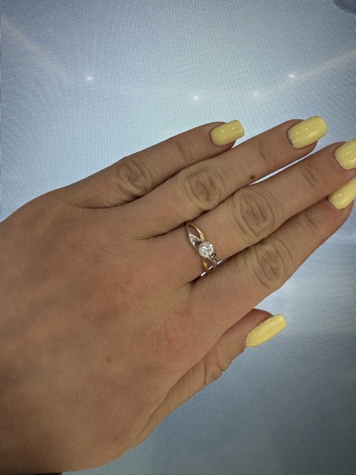 Кольцо с сияющим фианитом выполнено из красного и белого золота 585 пробы