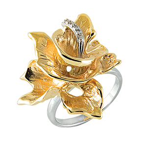 Восхитительное кольцо "Вивальди" выполнено в сочетании белого и желтого золота 585 пробы и инкрустировано бриллиантами