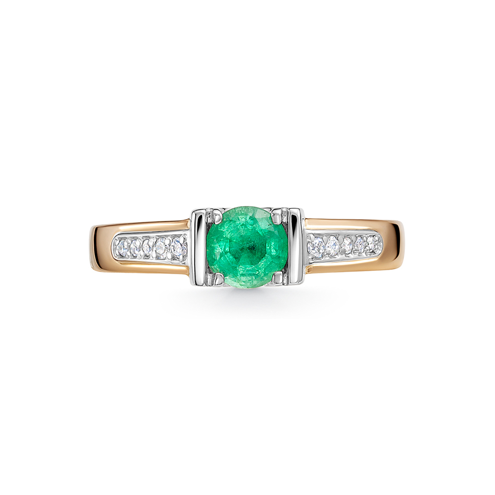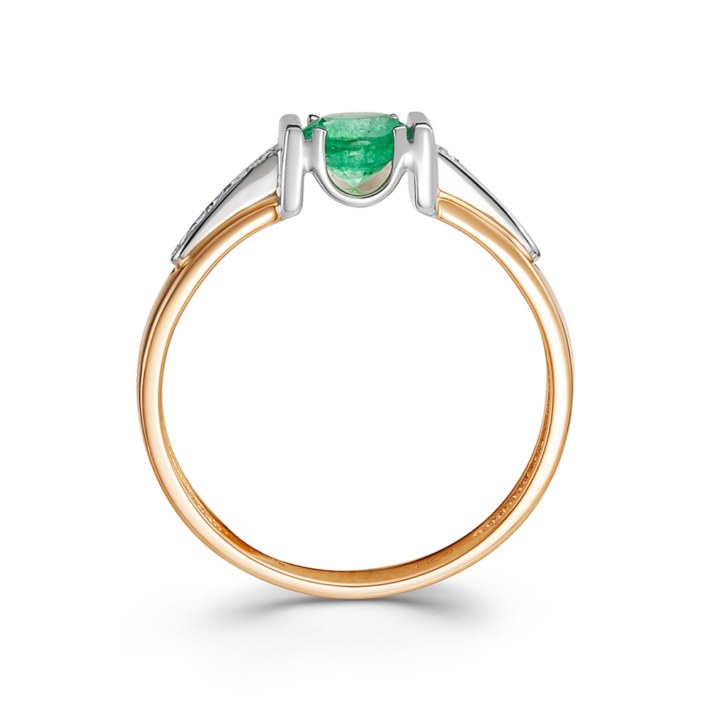 Кольцо с изумрудом круглой формы огранки, красоту и блеск которого подчёркивает дорожка бриллиантов, выполнено из красного и белого золота 585 пробы