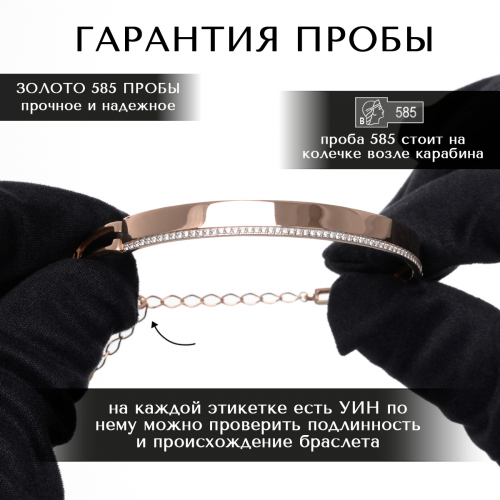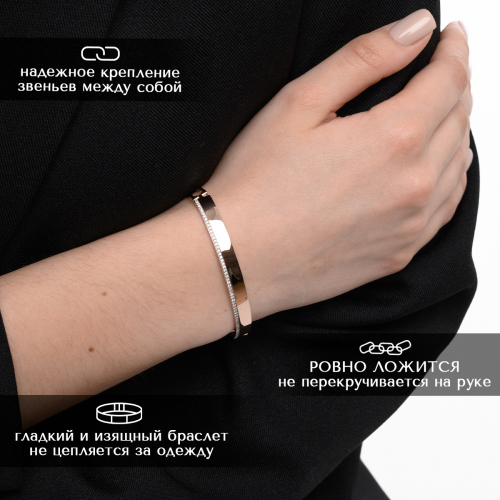 Элегантный жесткий браслет из красного и белого золота 585 пробы, украшенный дорожкой сверкающих фианитов. Размеры изделия регулируются от 16 до 21 см благодаря наличию длинного участка цепочки возле замка. Замок выполнен в виде надежного заводского карабина, гарантирующего комфорт и безопасность в носке. Контраст красного и белого золота подчеркивает красоту и блеск фианитов, делая украшение поистине роскошным и утонченным. Представлено брендом CARLIN. Средняя характеристика камней: 54 Фианит.