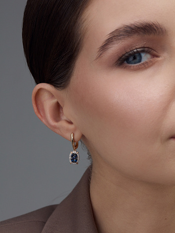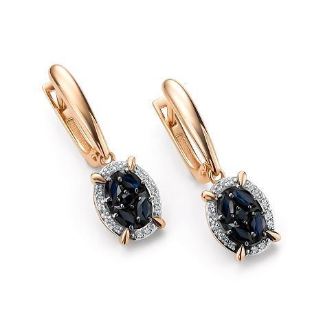 Роскошные серьги, выполнены в сочетании красного и белого золота 585 пробы, с сапфирами синего цвета в окружении искрящейся россыпи бриллиантов