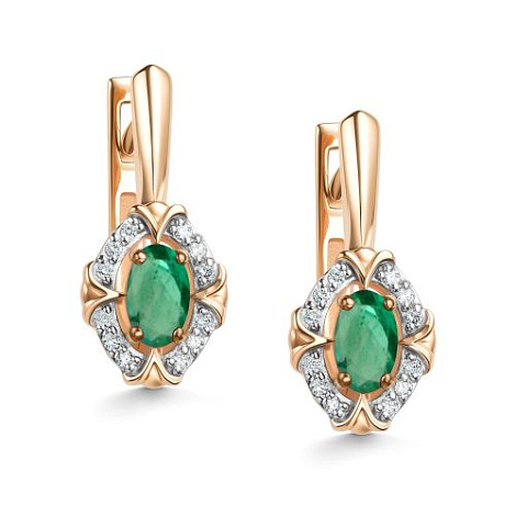 Роскошные длинные серьги, выполнены в сочетании красного и белого золота 585 пробы, украшены изумрудами и россыпью сияющих бриллиантов