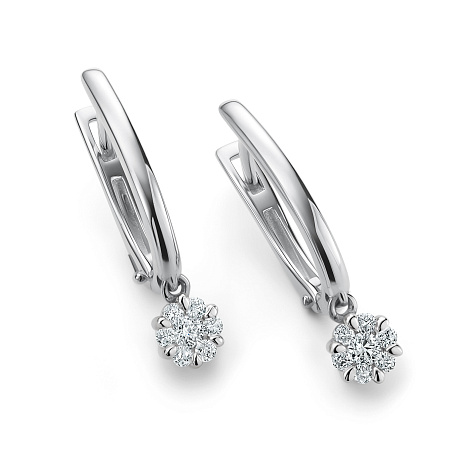 Роскошные серьги из белого золота 585 пробы с бриллиантами. Россыпь камней придает серьгам одновременно изящность и воздушный объем. Тип замка - английский, самый надежный и удобный. Модель лаконичная, с очень комфортной посадкой на ухо, за счет расположения замковой части ниже, чем декоративной части серьги. Средняя характеристика вставок: 2 Бриллиант Круг 57 0.089 4/6, 12 Бриллиант Круг 57 0.15 4/6 В комплект поставки входит: