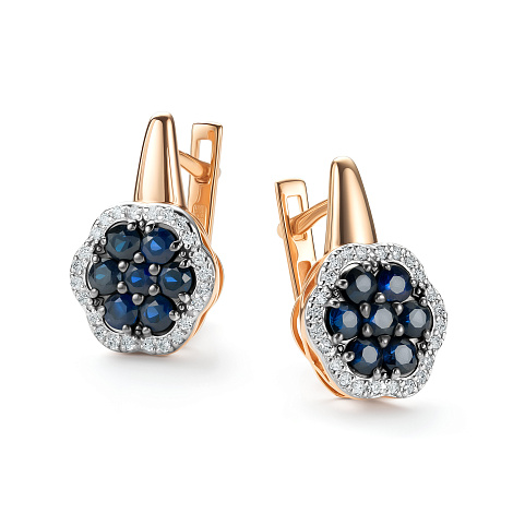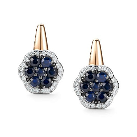 Роскошные серьги, выполнены в сочетании красного и белого золота 585 пробы, с сапфирами синего цвета в окружении искрящейся россыпи бриллиантов
