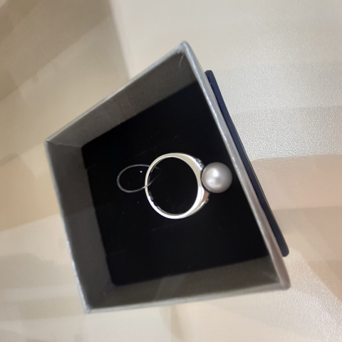 Кольцо с жемчугом, нежную красоту которого подчёркивают искры сверкающих бриллиантов, выполнено из белого золота 585 пробы