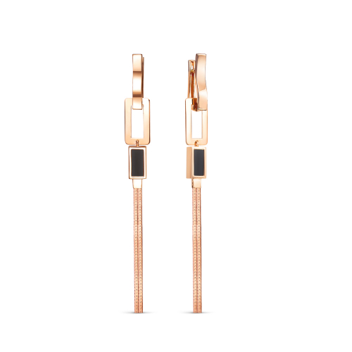 Эффектные удлинённые серьги выполнены в красном золоте 585 пробы и украшены черными ониксами