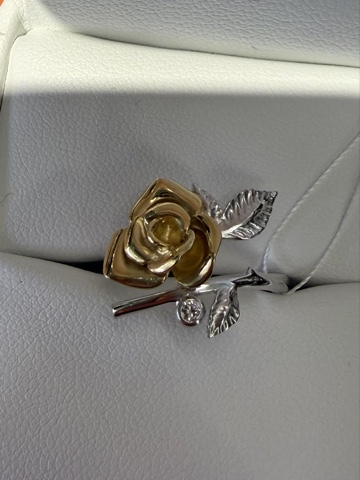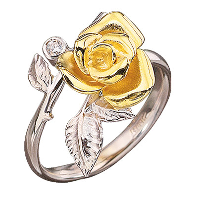 Красивое кольцо "Роза" в виде распустившегося цветка выполнено в сочетании белого и желтого золота 585 пробы