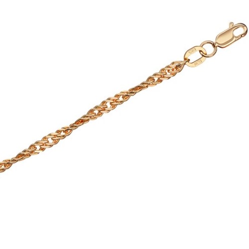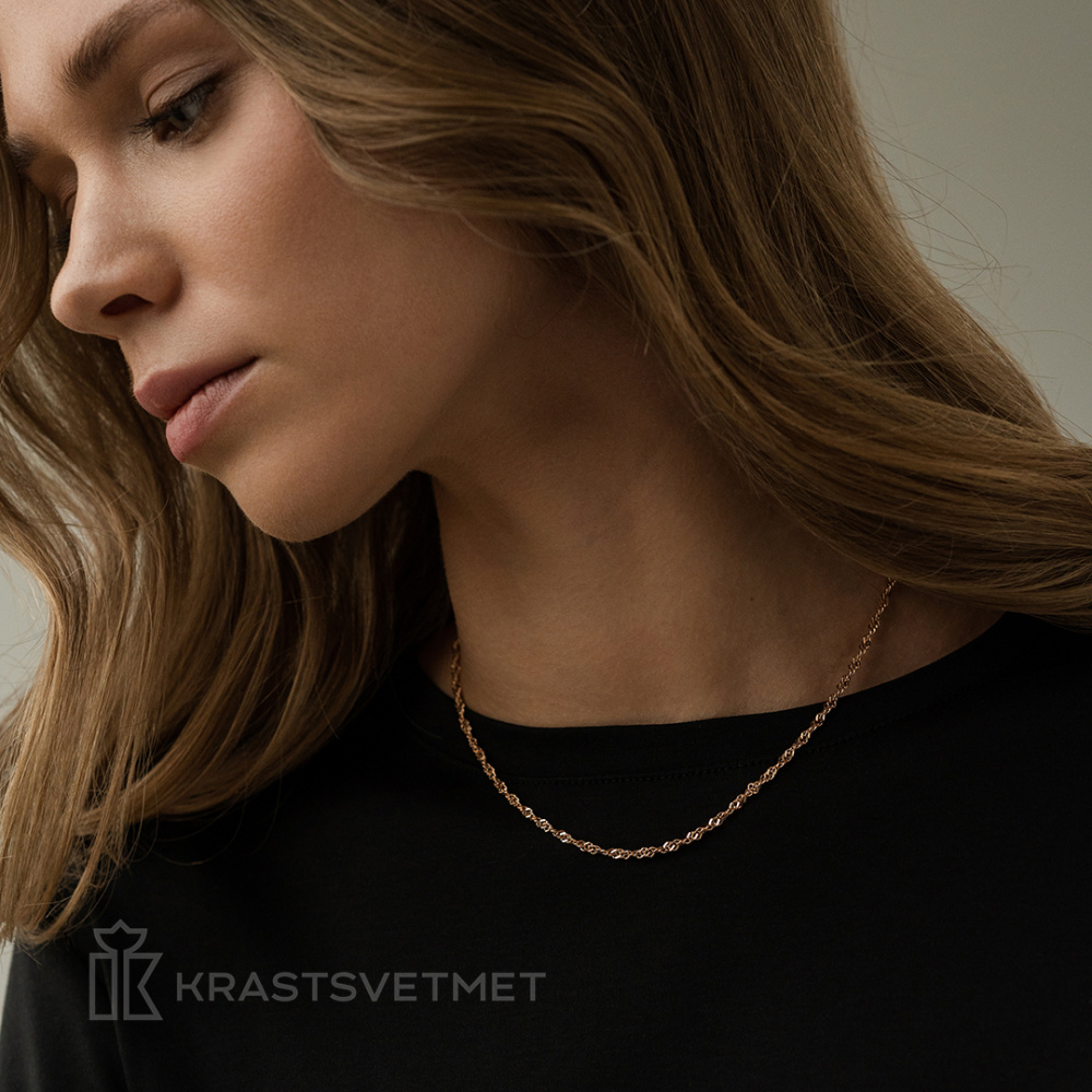 Цепь из красного золота 585 пробы с утончённым плетением «Сингапур» и изящной отделкой алмазной грани. Очаровательные закрутки звеньев в виде спиралей создают волнообразный узор, наполняющийся игрой света и тени при попадании солнца. Лаконичный и элегантный дизайн, соединяющий обаятельную внешность и выдающиеся эксплуатационные характеристики, способен удовлетворить вкусы как мужчин, так и женщин. Диаметр проволки 0,40 мм. Представлено брендом КРАСЦВЕТМЕТ. В комплект поставки входит: