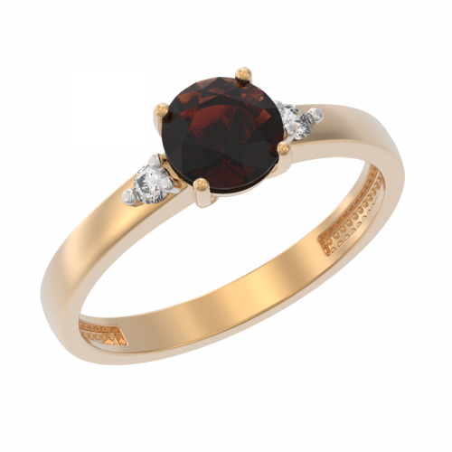 Кольцо с гранатом круглой формы огранки и фианитами, выполнено из красного золота 585 пробы