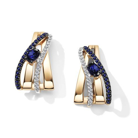 Серьги с сапфирами, красоту и насыщенный цвет которых подчёркивают дорожки бриллиантов и сапфиров, выполнены из красного и белого золота 585 пробы