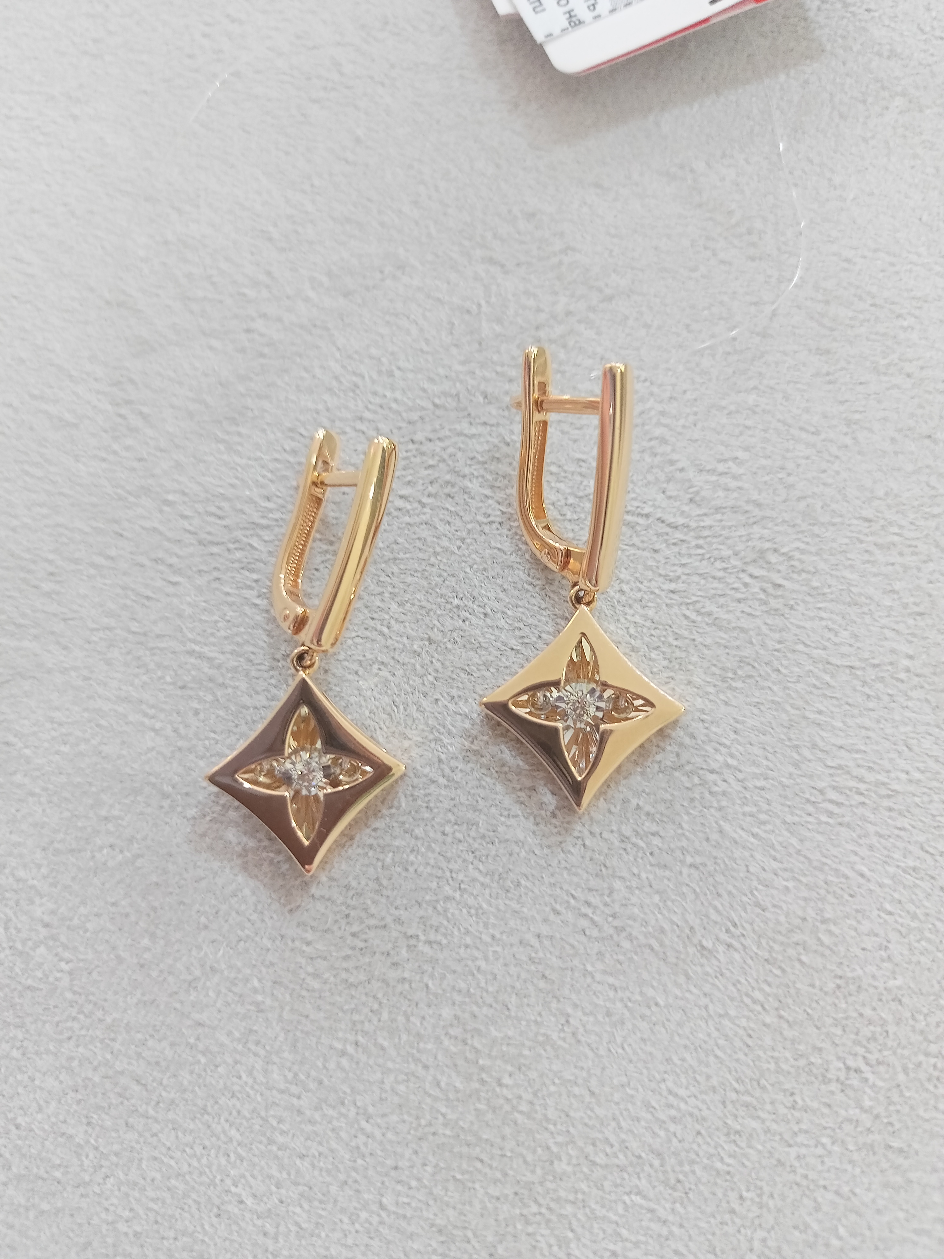 Оригинальные удлиненные серьги выполнены с сочетанием красного и белого золота 585 пробы