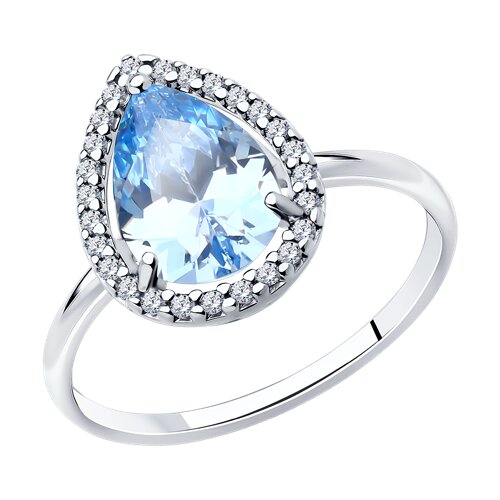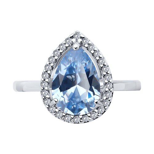 Стильное кольцо, выполнено из серебра 925 пробы, украшено россыпью сверкающих безцветных фианитов и одного фианита голубого цвета формы груша. Изделие представлено брендом SOKOLOV. Вставки: 27 × Фианит недраг В комплект поставки входит: