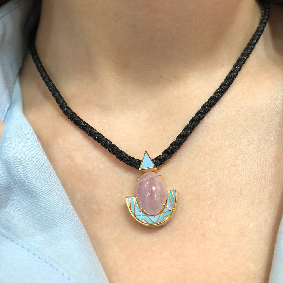 Серебряное колье 925 пробы с кунцитом, лавсановым шнуром и холодной эмалью очарует вас уникальным узором камня, созданным самой природой
