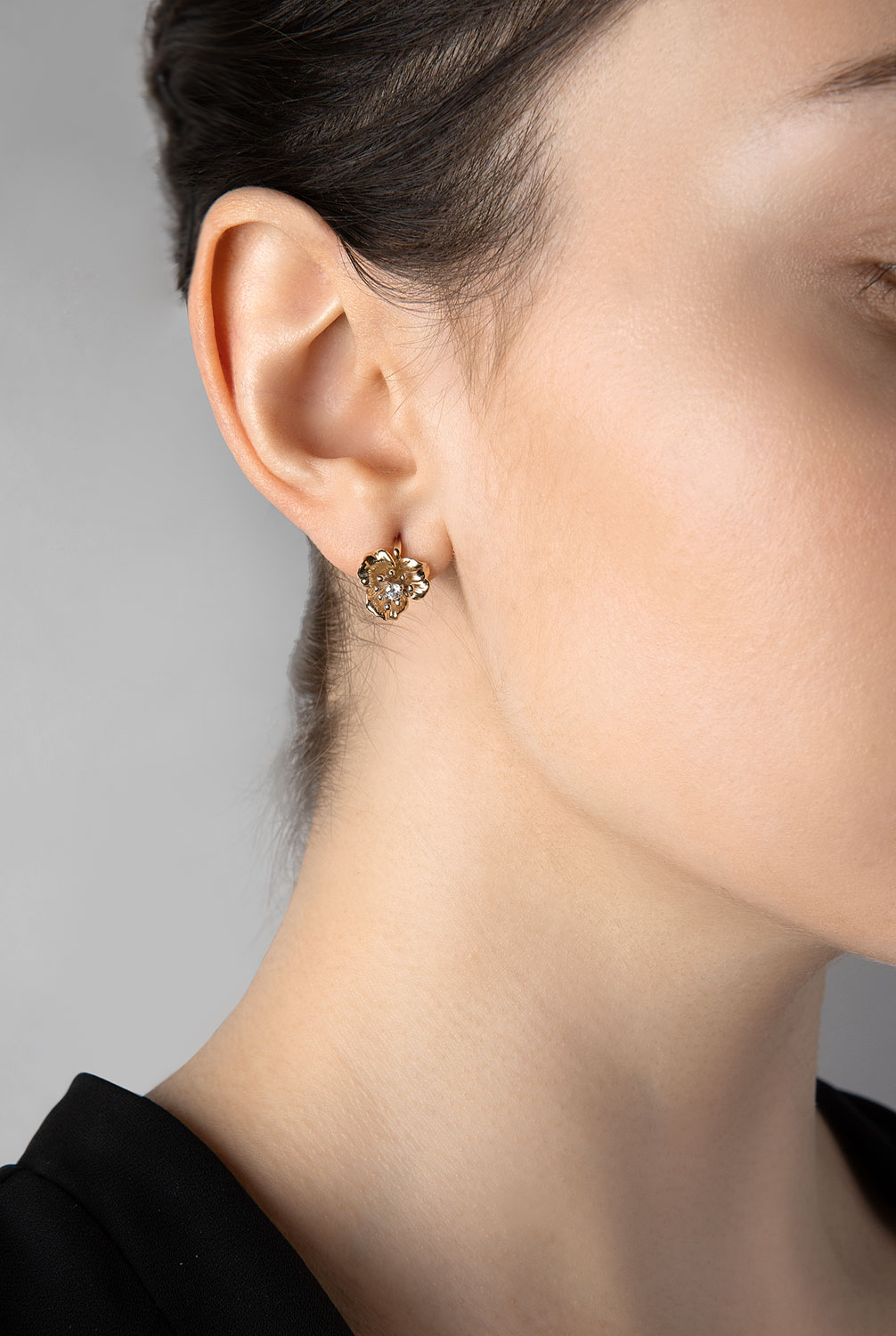 Чарующие серьги, выполненные в форме изящного распустившегося цветка, изготовлены из нежного желтого золота 585 пробы и дополнены искрящимися бриллиантами