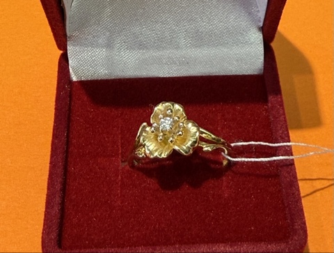 Нежное кольцо, в виде открытого цветка , выполнено из желтого золота 585 пробы, украшено сверкающим бриллиантом