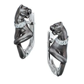 Серьги, в виде пантеры, выполнены в сочетании чёрного и белого золота 585 пробы, украшены сверкающими бриллиантами