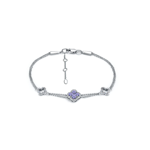 Двойной цепочный браслет с декоративной вставкой в форме цветка, украшенной танзанитами и бриллиантами, выполнен из белого золота 585 пробы