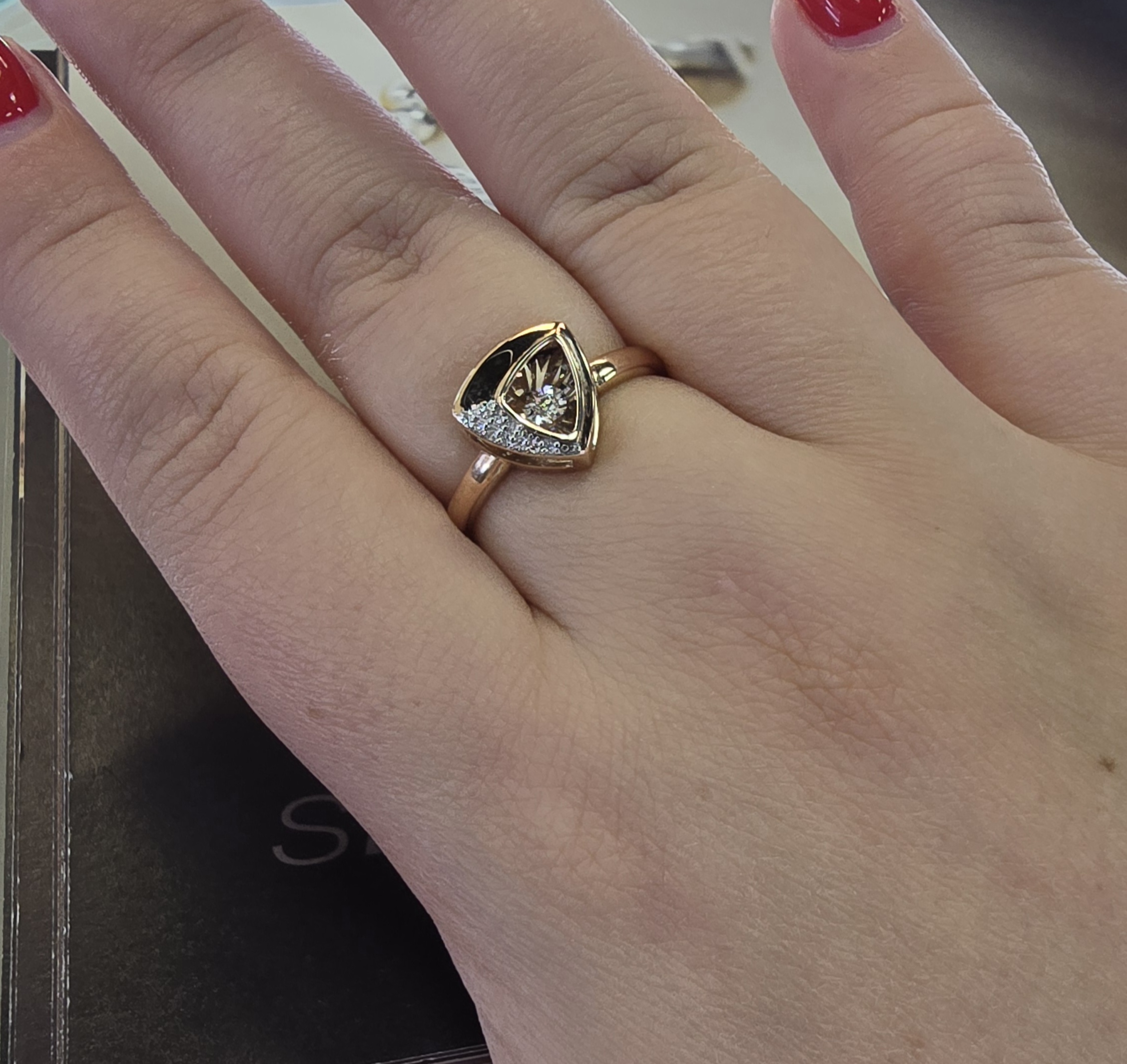 Стильное кольцо выполнено с сочетанием красного и белого золота 585 пробы, украшенное сияющими бриллиантами