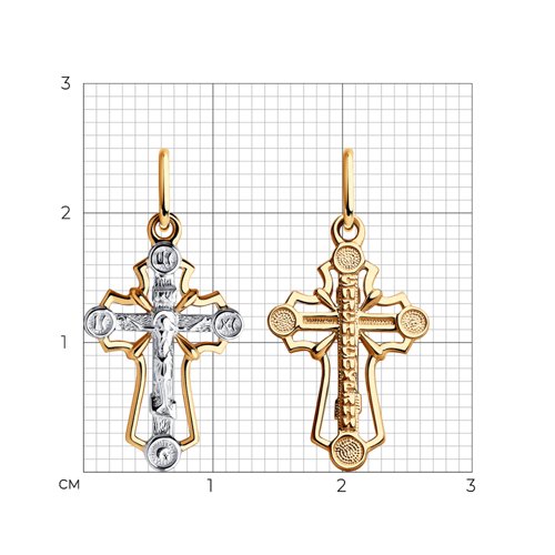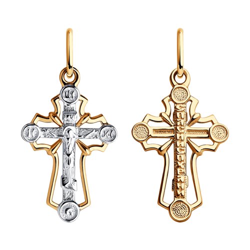 Подвеска в виде ажурного креста, в котором исполнены все каноны Православной Церкви, выполнена с сочетанием красного и белого золота 585 пробы. Изделие представлено брендом SOKOLOV. В комплект поставки входит: