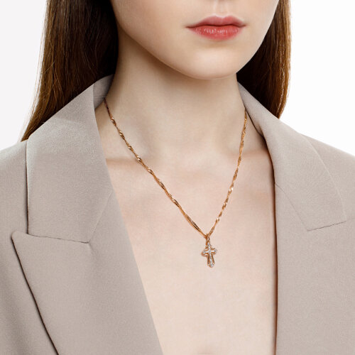 Подвеска в виде ажурного креста, в котором исполнены все каноны Православной Церкви, выполнена с сочетанием красного и белого золота 585 пробы