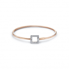 Современный женский жёсткий браслет выполнен из красного золота 585 пробы с геометрическим дизайном, украшенный россыпью сверкающих фианитов