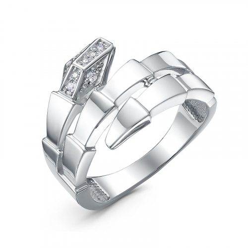 Объёмное кольцо в виде змеи, украшенной фианитами, выполнено из родированного серебра 925 пробы